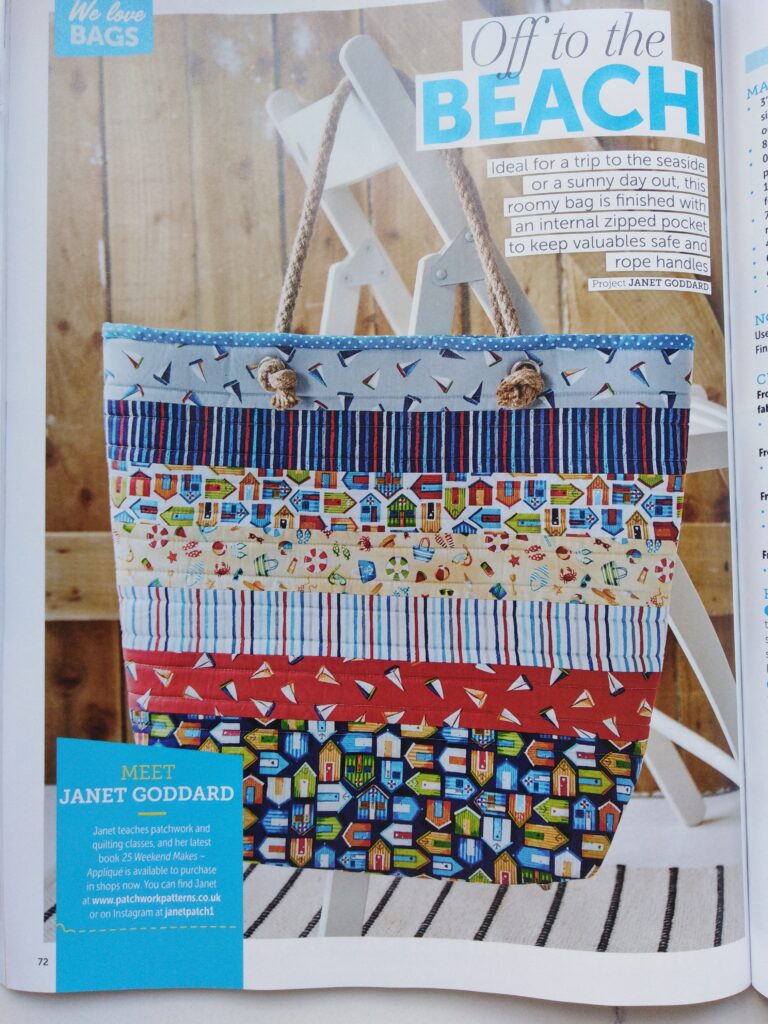It’s for a Beach Bag. The bag is stitched in fabrics from the ‘Beside the Sea’ collection from Makower. It is a super collection full of little boats, beach huts, sandy icons and stripes. The bag is fully lined with a turquoise spot fabric and has an inner zipped pocket to keep valuables safe. The bag is finished with rope handles. Hopefully when the bag is returned from the magazine the sun will come out and I will be able to use it.