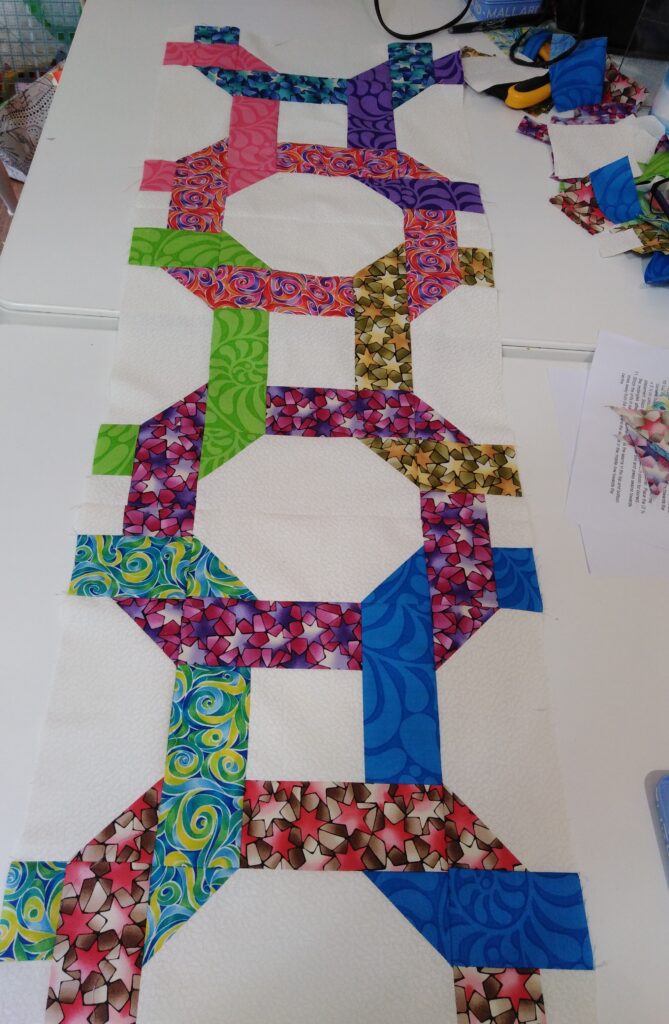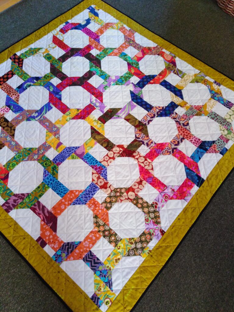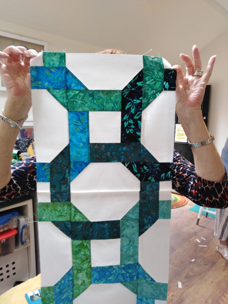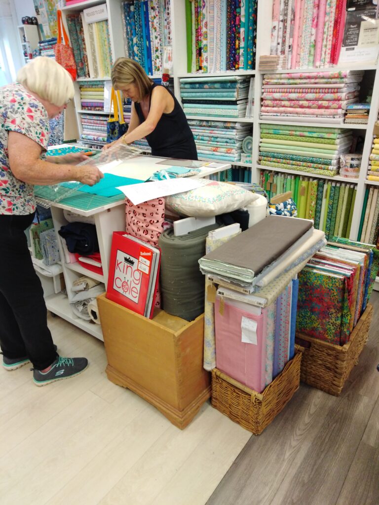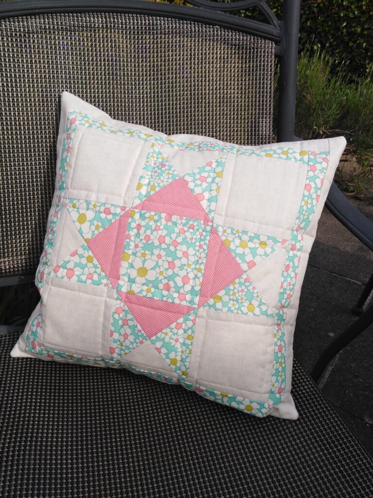 I taught two beginner workshops at Stitch and Knit in Hertfordshire where we worked on an Ohio Star cushion. The students learned to use rotary cutters, all about fabric choice, accurate piecing and quilting with the walking foot.