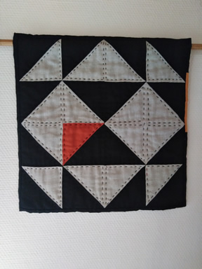 Thought that I would share this lovely wall hanging with you. This was not made by me but by my friend Sarah. Sarah only works in linen and works often in an abstract way; however in this instance she has taken a traditional block and put her own twist on it. She quilts with thick thread and every piece that she makes has two little red quilted stitches on it. Sarah gave me this for Christmas and it is now on the wall in my studio. How lucky am I?