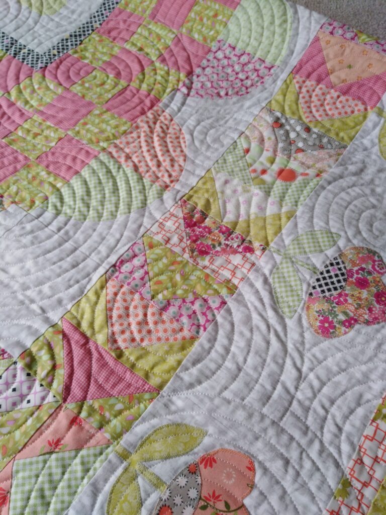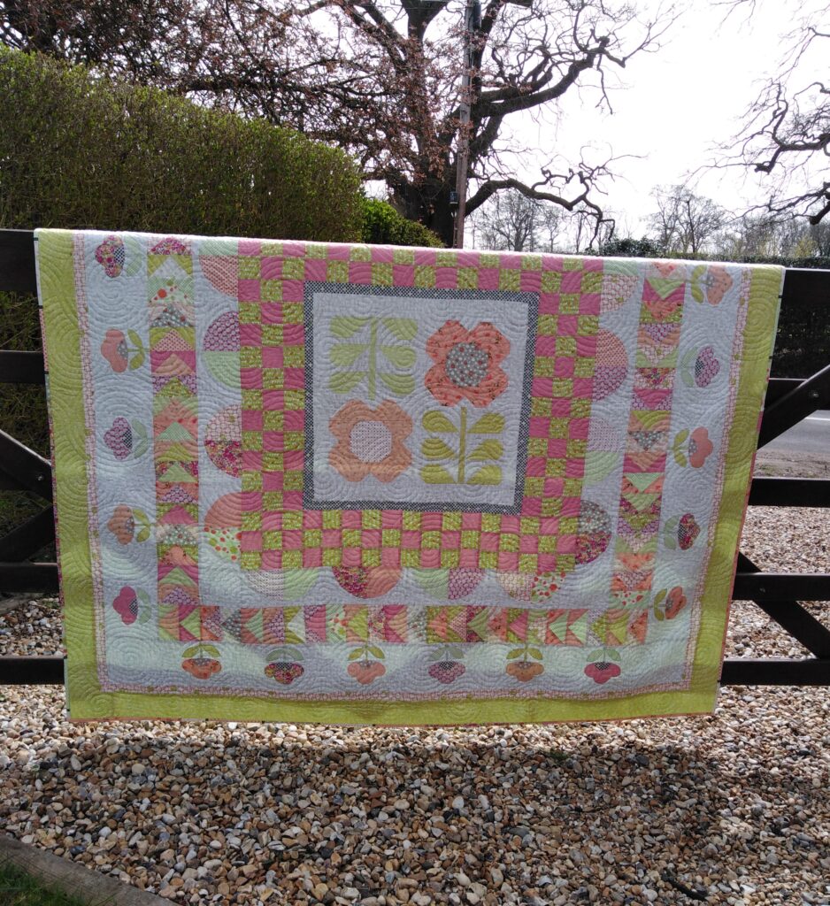 My Medallion quilt is now finished. I added a round of some retro styled appliqued flowers and then a narrow plain border and a wider plain outer border. I sent the quilt off to be long arm quilted by Cut&Alter and Abigail has made a fantastic job of it. She has quilted it with a swirly circular design in a pearl thread which allows the colours in the fabric shine through.